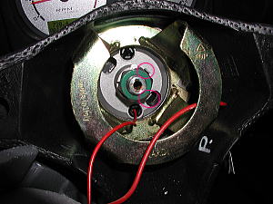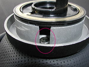 | まず、カシメが2箇所あるので、ドライバーかラジペンか何かでめくります。 | 後はグリーンのネジを緩めれば、かなり力を入れて引っ張ります。 結構泣きそうなくらい大変でした。 ステアリングを引っ張る時は、体が後ろに飛ぶと危険なので、ネジを外さないでぎりぎりくらいまで緩めた段階で引っ張ります。 そうすれば、外れても体が後ろに行くことはありません。 もし、ステアリングのリムーバーなんかの専用工具があれば楽でしょうね。 |