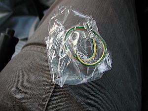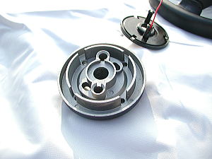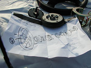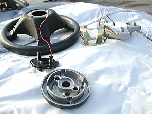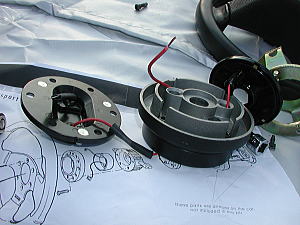 | さてさて。アースは線の皮を剥いて、スペーサーと一緒に固定することにしました。 | 終わってから気が付いたんだけど、アース用の線が入ってました。 だけど、ステアリングのホーン・ボタンと一緒に入っていて、すぐに分かるわけがないって。 さすがにロータス・・・感動してしまいました。色もロータスカラーだし。(笑) |